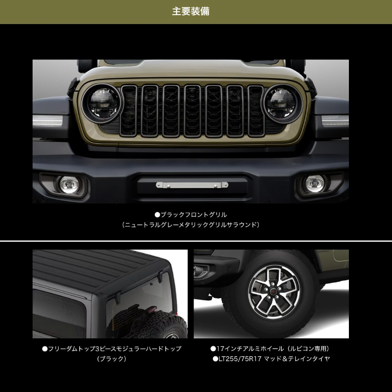 | 「冒険に、2ドアの相棒を。」 理想的な冒険は、理想的な冒険から始まる。 あなたの好奇心をくすぐる、Wrangler Rubicon 2ドアタイプが登場! ボディが小さいからこそできる走りや身のこなしが、あなたをまだ見ぬ冒険に導いてくれるはず。 さあ、タフな冒険と、新たな冒険に出かけよう! | |