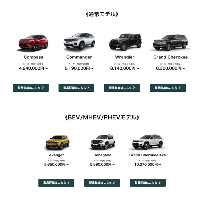 | 見たいJEEPがきっとある。 本物好きなあなたに見てほしい、Jeep自慢のラインナップ。 長く愛される定番モデルから、今だけの限定モデルまで。 JEEPの今を代表する顔ぶれがショールームに勢揃い。 理想の1台はもう目の前に。 新しい冒険のきっかけを、このフェアで見つけよう。 | |